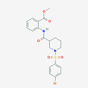 The mechanism of action of Methyl 2-[[1-(4-bromophenyl)sulfonylpiperidine-3-carbonyl]amino]benzoate involves its interaction with specific molecular targets. The sulfonyl group can form strong interactions with amino acid residues in proteins, leading to inhibition or modulation of enzyme activity. The aromatic and piperidine moieties contribute to the compound’s binding affinity and specificity.