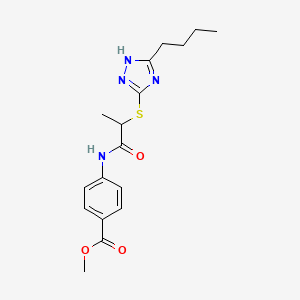 Methyl 4-({2-[(5-butyl-4H-1,2,4-triazol-3-yl)sulfanyl]propanoyl}amino)benzoate is a synthetic compound belonging to the class of triazole derivatives. This compound has garnered attention due to its potential applications in medicinal chemistry and agriculture, primarily attributed to its unique structure and biological activities.