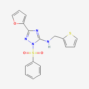 3-(furan-2-yl)-1-(phenylsulfonyl)-N-(thiophen-2-ylmethyl)-1H-1,2,4-triazol-5-amine is a complex organic compound that features a triazole ring substituted with furyl, phenylsulfonyl, and thienylmethyl groups