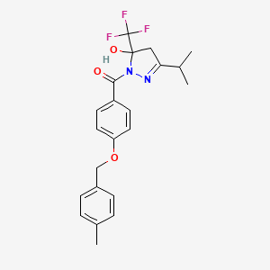 [5-hydroxy-3-propan-2-yl-5-(trifluoromethyl)-4H-pyrazol-1-yl]-[4-[(4-methylphenyl)methoxy]phenyl]methanone is a complex organic compound with a unique structure that includes an isopropyl group, a trifluoromethyl group, and a pyrazol ring