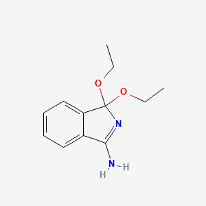 The core of the target molecule is the 1H-isoindol-3-amine structure. This consists of a five-membered nitrogen-containing ring fused to a benzene ring. The "1H" designation indicates that the saturation is at the first position of the isoindole ring system. An amine group is substituted at the 3-position. The nomenclature "1,1-diethoxy-" specifies the presence of two ethoxy (-OCH2CH3) groups attached to the C1 position of the isoindole ring. This geminal diether arrangement results in a tetrahedral sp3-hybridized carbon at this position, a notable deviation from the sp2-hybridized carbon in the parent aromatic isoindole.