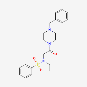 The synthesis of N-[2-(4-benzylpiperazin-1-yl)-2-oxoethyl]-N-ethylbenzenesulfonamide typically involves multiple steps. One common synthetic route begins with the reaction of 4-benzylpiperazine with an appropriate acylating agent to form an intermediate compound. This intermediate is then reacted with N-ethylbenzenesulfonamide under specific conditions to yield the final product. Industrial production methods may involve optimization of reaction conditions such as temperature, solvent, and catalysts to maximize yield and purity .