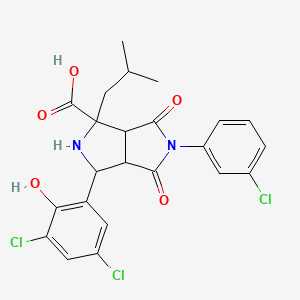 This compound is a highly substituted pyrrolo[3,4-c]pyrrole derivative, characterized by a bicyclic framework with two fused pyrrole rings. Its structure includes a 3-chlorophenyl group at position 5, a 3,5-dichloro-2-hydroxyphenyl group at position 3, and a 2-methylpropyl (isobutyl) substituent at position 1. The carboxylic acid moiety at position 1 enhances polarity, while the chlorine atoms and hydroxyl group contribute to its electronic and steric profile .
