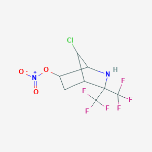 7-CHLORO-3,3-BIS(TRIFLUOROMETHYL)-2-AZABICYCLO[2.2.1]HEPTAN-6-YL NITRATE is a complex organic compound with a unique bicyclic structure. This compound is characterized by the presence of a chlorine atom, three trifluoromethyl groups, and a nitrate group attached to a bicyclic azabicycloheptane framework. The compound’s distinct structure makes it an interesting subject for various chemical and biological studies.
