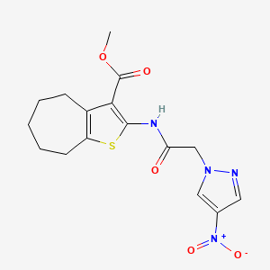 The synthesis of METHYL 2-[2-(4-NITRO-1H-PYRAZOL-1-YL)ACETAMIDO]-4H,5H,6H,7H,8H-CYCLOHEPTA[B]THIOPHENE-3-CARBOXYLATE typically involves multiple steps, including the formation of the pyrazole ring, the introduction of the nitro group, and the construction of the thiophene ring. Common reagents used in these reactions include hydrazines, diketones, and sulfur-containing compounds. The reaction conditions often involve the use of catalysts, solvents, and controlled temperatures to ensure the desired product is obtained with high yield and purity .