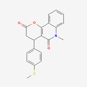 The synthesis of 6-METHYL-4-[4-(METHYLSULFANYL)PHENYL]-2H,3H,4H,5H,6H-PYRANO[3,2-C]QUINOLINE-2,5-DIONE typically involves multi-step organic reactions. One common method includes the condensation of a suitable quinoline derivative with a methylthio-substituted benzaldehyde under acidic conditions. The reaction is followed by cyclization to form the pyranoquinoline core. The reaction conditions often require controlled temperatures and the use of catalysts to ensure high yields and purity.