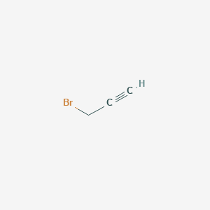 Propargyl bromide, systematically named 3-bromo-1-propyne, is a highly reactive and versatile organic compound with the chemical formula HC≡CCH₂Br.[1] It is a halogenated alkyne characterized by a terminal acetylene (B1199291) group and a bromine atom on the adjacent sp³-hybridized carbon.[1] This structure makes it a potent alkylating agent and a valuable intermediate in a wide array of chemical transformations.[1][2] this compound is a colorless to light yellow liquid with a sharp, pungent odor and lachrymatory effects.[1][3] Its utility spans organic synthesis, the preparation of resins, agricultural chemicals, and as an intermediate in the synthesis of pharmaceuticals.[3][4][5] Notably, it is a key building block in the development of complex molecules, including anti-inflammatory agents and antibody-drug conjugates (ADCs).[3][6] Due to its high reactivity and potential for explosive decomposition, stringent safety protocols are imperative when handling this compound.[1][3]
