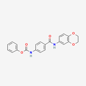 Phenyl {4-[(2,3-dihydro-1,4-benzodioxin-6-ylamino)carbonyl]phenyl}carbamate is a complex organic compound with potential applications in various scientific fields. This compound features a phenyl group attached to a carbamate moiety, which is further linked to a 2,3-dihydro-1,4-benzodioxin-6-ylamino group. The unique structure of this compound makes it an interesting subject for research in chemistry, biology, medicine, and industry.