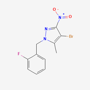 4-Bromo-1-[(2-fluorophenyl)methyl]-5-methyl-3-nitropyrazole is a synthetic organic compound that belongs to the pyrazole family This compound is characterized by the presence of a bromine atom, a fluorobenzyl group, a methyl group, and a nitro group attached to the pyrazole ring