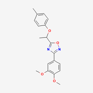 The synthesis of 3-(3,4-dimethoxyphenyl)-5-[1-(4-methylphenoxy)ethyl]-1,2,4-oxadiazole typically involves the cyclization of appropriate precursors under specific conditions. One common method involves the reaction of 3,4-dimethoxybenzohydrazide with 4-methylphenoxyacetyl chloride in the presence of a base such as triethylamine. The reaction mixture is then heated to promote cyclization, forming the oxadiazole ring.