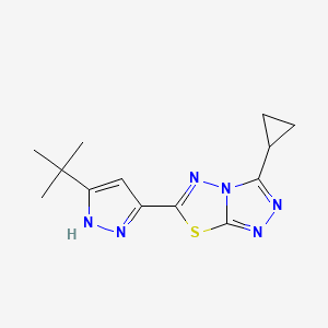 6-(5-tert-butyl-1H-pyrazol-3-yl)-3-cyclopropyl[1,2,4]triazolo[3,4-b][1,3,4]thiadiazole plays a significant role in various biochemical reactions. It interacts with several enzymes and proteins, including carbonic anhydrase, cholinesterase, and alkaline phosphatase. These interactions are primarily inhibitory, where the compound binds to the active sites of these enzymes, preventing their normal function. This inhibition can lead to various therapeutic effects, such as reducing inflammation or slowing the progression of certain diseases.