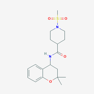 The synthetic routes and reaction conditions for N-(2,2-DIMETHYL-3,4-DIHYDRO-2H-1-BENZOPYRAN-4-YL)-1-METHANESULFONYLPIPERIDINE-4-CARBOXAMIDE involve several steps. The preparation typically starts with the synthesis of the 1-benzopyran moiety, followed by the introduction of the piperidine and methanesulfonyl groups. Industrial production methods may involve optimizing reaction conditions such as temperature, pressure, and the use of catalysts to increase yield and purity.