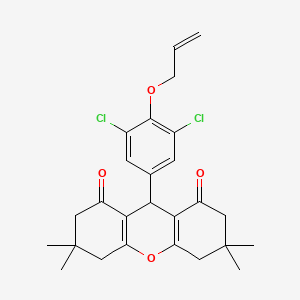 The compound 9-[3,5-dichloro-4-(prop-2-en-1-yloxy)phenyl]-3,3,6,6-tetramethyl-3,4,5,6,7,9-hexahydro-1H-xanthene-1,8(2H)-dione is a complex organic molecule with potential applications in various scientific fields. This compound features a xanthene core, which is a tricyclic structure, and is substituted with multiple functional groups, including dichloro, prop-2-en-1-yloxy, and tetramethyl groups. The presence of these diverse functional groups makes it a versatile compound for chemical reactions and applications.