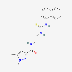1,5-DIMETHYL-N~3~-(2-{[(1-NAPHTHYLAMINO)CARBOTHIOYL]AMINO}ETHYL)-1H-PYRAZOLE-3-CARBOXAMIDE is a complex organic compound known for its unique chemical structure and potential applications in various scientific fields. This compound features a pyrazole ring substituted with a naphthylaminocarbothioyl group, making it a subject of interest in medicinal chemistry and material science.