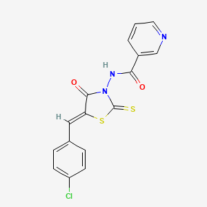 The synthesis of N-[5-(4-Chloro-benzylidene)-4-oxo-2-thioxo-thiazolidin-3-yl]-nicotinamide typically involves a multi-step process. One common method includes the condensation of 4-chlorobenzaldehyde with thiosemicarbazide to form a thiosemicarbazone intermediate. This intermediate then undergoes cyclization with chloroacetic acid to form the thiazolidinone ring. Finally, the nicotinamide moiety is introduced through a nucleophilic substitution reaction .