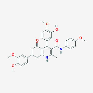 The exact mass of the compound 7-(3,4-dimethoxyphenyl)-4-(3-hydroxy-4-methoxyphenyl)-N-(4-methoxyphenyl)-2-methyl-5-oxo-1,4,5,6,7,8-hexahydro-3-quinolinecarboxamide is 570.23660143 g/mol and the complexity rating of the compound is 1050. The storage condition is unknown. Please store according to label instructions upon receipt of goods.