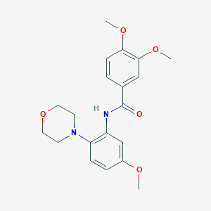 The synthesis of 3,4-dimethoxy-N-(5-methoxy-2-morpholin-4-ylphenyl)benzamide typically involves the reaction of 3,4-dimethoxybenzoic acid with 5-methoxy-2-morpholin-4-ylphenylamine. The reaction is usually carried out in the presence of a coupling agent such as N,N’-dicyclohexylcarbodiimide (DCC) and a catalyst like 4-dimethylaminopyridine (DMAP) in an organic solvent such as dichloromethane (DCM) at room temperature .