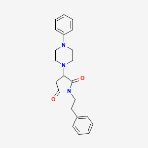 1-Phenethyl-3-(4-phenylpiperazin-1-yl)pyrrolidine-2,5-dione is a synthetic compound featuring a pyrrolidine-2,5-dione (succinimide) core substituted at the 1-position with a phenethyl group and at the 3-position with a 4-phenylpiperazine moiety. This structural design integrates pharmacophores associated with anticonvulsant and neuroactive properties, as evidenced by analogs in the literature . The pyrrolidine-2,5-dione scaffold is critical for binding to neuronal ion channels and enzymes like GABA-transaminase (GABA-T), while the 4-phenylpiperazine group may enhance receptor affinity and pharmacokinetic properties .