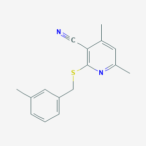 4,6-Dimethyl-2-[(3-methylphenyl)methylsulfanyl]pyridine-3-carbonitrile is an organic compound with the molecular formula C15H14N2S It is a derivative of pyridine, characterized by the presence of a nitrile group at the 3-position, two methyl groups at the 4- and 6-positions, and a methylsulfanyl group attached to a 3-methylphenyl group at the 2-position