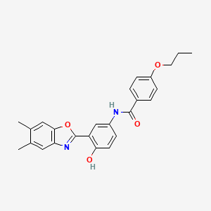 N-[3-(5,6-dimethyl-1,3-benzoxazol-2-yl)-4-hydroxyphenyl]-4-propoxybenzamide is a complex organic compound known for its unique structural properties and potential applications in various scientific fields. This compound features a benzoxazole ring, a hydroxyphenyl group, and a propoxybenzamide moiety, which contribute to its distinct chemical behavior and potential utility in research and industry.