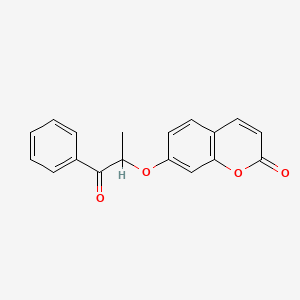 The structure of the title compound is characterized by the etherification of the hydroxyl group at position 7 of the coumarin nucleus with a 1-phenyl-1-propan-2-one moiety. This substitution introduces several key structural features: a flexible ether linkage, a chiral center at the methyl-substituted carbon, and a terminal phenyl ketone group. These additions significantly increase the molecular complexity compared to the simple coumarin core, offering new potential points of interaction with biological macromolecules. The synthesis of such 7-alkoxy derivatives is commonly achieved through the Williamson ether synthesis, reacting a 7-hydroxycoumarin with a suitable halo-ketone. mdpi.comnih.gov