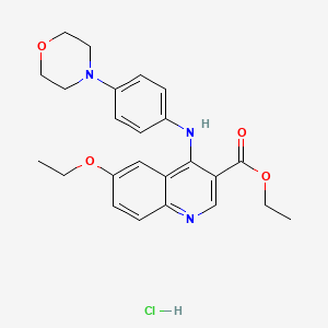 Ethyl 6-ethoxy-4-(4-morpholin-4-ylanilino)quinoline-3-carboxylate;hydrochloride is a complex organic compound that belongs to the quinoline family. This compound is characterized by its unique structure, which includes a quinoline core substituted with ethoxy, morpholin-4-ylanilino, and carboxylate groups. The hydrochloride salt form enhances its solubility in aqueous solutions, making it suitable for various applications in scientific research and industry.