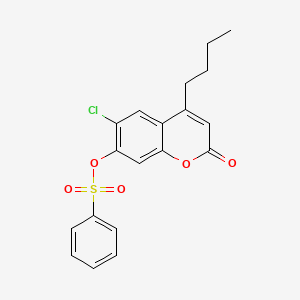 4-BUTYL-6-CHLORO-2-OXO-2H-CHROMEN-7-YL 1-BENZENESULFONATE is a synthetic organic compound belonging to the class of coumarins. Coumarins are known for their diverse biological activities and are widely used in medicinal chemistry. This particular compound is characterized by the presence of a butyl group, a chlorine atom, and a benzenesulfonate ester, which contribute to its unique chemical properties.
