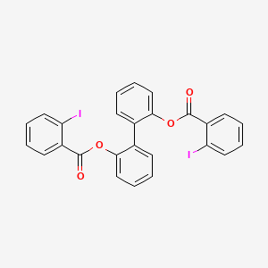 2,2'-Biphenyldiyl bis(2-iodobenzoate) is a dimeric aromatic ester compound featuring two 2-iodobenzoate moieties linked via a biphenyl backbone. The iodine atoms occupy the ortho positions on the benzoate rings, conferring unique electronic and steric properties. The biphenyl core enhances rigidity, while the electron-withdrawing iodine atoms facilitate reactivity in metal-catalyzed transformations, such as Suzuki-Miyaura couplings .
