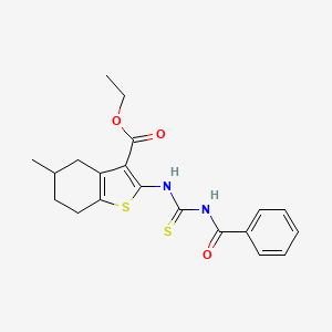 The synthesis of ETHYL 5-METHYL-2-{[(PHENYLFORMAMIDO)METHANETHIOYL]AMINO}-4,5,6,7-TETRAHYDRO-1-BENZOTHIOPHENE-3-CARBOXYLATE typically involves multi-step organic reactions. One common synthetic route includes the formation of the benzothiophene core followed by the introduction of the ethyl ester and other functional groups. Reaction conditions often involve the use of catalysts, solvents, and controlled temperatures to ensure high yields and purity. Industrial production methods may involve large-scale synthesis using optimized reaction conditions to produce the compound in bulk quantities.