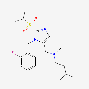 N-[[3-[(2-fluorophenyl)methyl]-2-propan-2-ylsulfonylimidazol-4-yl]methyl]-N,3-dimethylbutan-1-amine is a complex organic compound with a unique structure that includes a fluorophenyl group, an imidazole ring, and a sulfonyl group