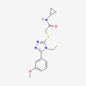 The synthesis of N-cyclopropyl-2-{[4-ethyl-5-(3-methoxyphenyl)-4H-1,2,4-triazol-3-yl]sulfanyl}acetamide typically involves multiple steps, starting with the preparation of the triazole ring. The triazole ring can be synthesized through a cyclization reaction involving hydrazine and an appropriate nitrile compound. The methoxyphenyl group is then introduced through a substitution reaction, followed by the addition of the cyclopropyl group via a cyclopropanation reaction. The final step involves the formation of the acetamide group through an amidation reaction.