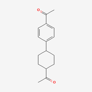 The mechanism of action of 1-[4-(4-Acetylphenyl)cyclohexyl]ethanone involves its interaction with specific molecular targets. The acetyl group can participate in hydrogen bonding and other non-covalent interactions, influencing the compound’s binding affinity to enzymes or receptors. The cyclohexyl and phenyl groups contribute to the compound’s hydrophobic interactions, affecting its overall bioactivity and pharmacokinetics.