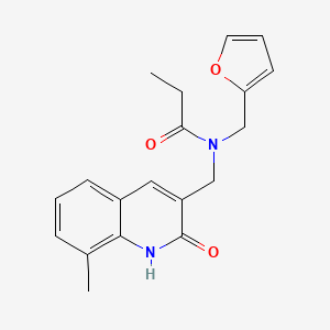 The presence of both the 8-methyl and 2-oxo groups in the quinoline moiety, along with the furan ring, makes “N-(furan-2-ylmethyl)-N-[(8-methyl-2-oxo-1H-quinolin-3-yl)methyl]propanamide” unique. These structural features may enhance its binding affinity and specificity for certain biological targets, making it a valuable compound for research and development.