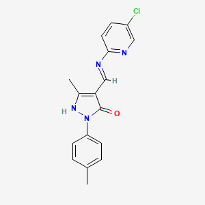 4-{[(5-CHLOROPYRIDIN-2-YL)AMINO]METHYLIDENE}-3-METHYL-1-(4-METHYLPHENYL)-4,5-DIHYDRO-1H-PYRAZOL-5-ONE is a complex organic compound characterized by its unique structure, which includes a chloropyridinyl group, a methylidene group, and a dihydropyrazolone core