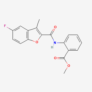 The mechanism of action of methyl 2-{[(5-fluoro-3-methyl-1-benzofuran-2-yl)carbonyl]amino}benzoate involves its interaction with specific molecular targets and pathways. The compound is believed to exert its effects by binding to enzymes or receptors, thereby modulating their activity. The exact molecular targets and pathways involved are still under investigation .