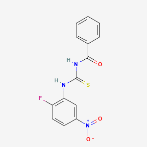 The synthesis of 1-benzoyl-3-(2-fluoro-5-nitrophenyl)thiourea typically involves the reaction of benzoyl isothiocyanate with 2-fluoro-5-nitroaniline in the presence of a suitable solvent, such as dry acetone . The reaction proceeds under mild conditions, resulting in the formation of the desired thiourea derivative. Industrial production methods may involve similar synthetic routes, with optimization for large-scale production and purification processes.