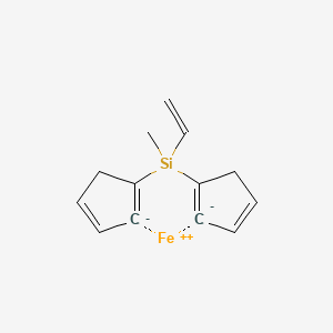 Methyl vinylsila ferrocenophane (CAS: 155892-90-3) is a silicon-bridged metallocene with the molecular formula $$ \text{C}{13}\text{H}{14}\text{FeSi} $$ and a molecular weight of 254.18 g/mol. Its IUPAC name, di(cyclopenta-1,3-dien-1-yl)-ethenyl-methylsilane;iron(2+) , reflects its structural composition: two cyclopentadienyl (Cp) rings coordinated to an iron center, bridged by a methylvinylsilane group. Key identifiers include: