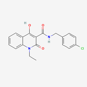 N-[(4-Chlorophenyl)methyl]-1-ethyl-4-hydroxy-2-oxo-1,2-dihydroquinoline-3-carboxamide is a synthetic organic compound that belongs to the quinoline family This compound is characterized by its complex structure, which includes a quinoline core, a chlorophenyl group, and a carboxamide group