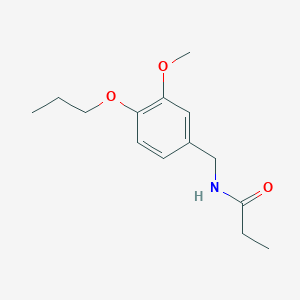 The synthesis of N-(3-methoxy-4-propoxybenzyl)propanamide typically involves the reaction of 3-methoxy-4-propoxybenzylamine with propanoyl chloride under controlled conditions. The reaction is usually carried out in the presence of a base such as triethylamine to neutralize the hydrochloric acid formed during the reaction. The reaction mixture is then purified using standard techniques such as recrystallization or chromatography to obtain the desired product.