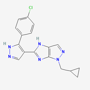 The synthesis of 5-[5-(4-chlorophenyl)-1H-pyrazol-4-yl]-1-(cyclopropylmethyl)-4H-imidazo[4,5-c]pyrazole typically involves multi-step reactions starting from readily available precursors. One common approach is the cyclization of appropriate hydrazine derivatives with α,β-unsaturated carbonyl compounds . The reaction conditions often include the use of catalysts such as vitamin B1, which facilitates the cyclocondensation process .