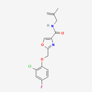 2-[(2-chloro-4-fluorophenoxy)methyl]-N-(2-methylprop-2-enyl)-1,3-oxazole-4-carboxamide is a complex organic compound with potential applications in various scientific fields. This compound features a unique structure that includes a chlorinated and fluorinated phenoxy group, an oxazole ring, and a carboxamide group, making it a subject of interest for researchers in chemistry, biology, and medicine.