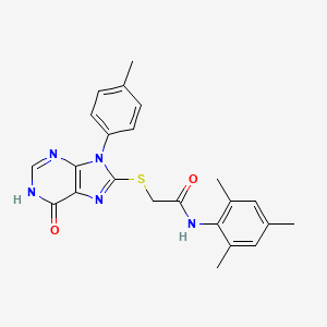 2-{[9-(4-methylphenyl)-6-oxo-6,9-dihydro-1H-purin-8-yl]sulfanyl}-N-(2,4,6-trimethylphenyl)acetamide is a complex organic compound with potential applications in various scientific fields. This compound features a purine core, a sulfanyl group, and an acetamide moiety, making it a unique molecule for research and industrial purposes.