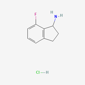 7-Fluoro-2,3-dihydro-1H-inden-1-amine hydrochloride: is an organic compound with the molecular formula C9H11ClFN . It is a derivative of indene, featuring a fluorine atom at the 7th position and an amine group at the 1st position, stabilized as a hydrochloride salt. This compound is typically a white to yellow solid and is used in various chemical and pharmaceutical research applications .