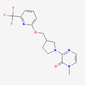 This compound features a 1,2-dihydropyrazin-2-one core substituted with a methyl group at position 1 and a pyrrolidine moiety at position 2. The pyrrolidine is further modified with a methyloxypyridine group bearing a trifluoromethyl substituent at position 6 of the pyridine ring . The trifluoromethyl group is a common pharmacophore in medicinal chemistry, known to enhance metabolic stability and lipophilicity, while the pyrrolidine ring may influence conformational flexibility and receptor binding .
