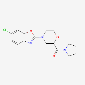 The mechanism of action of 6-chloro-2-[2-(pyrrolidine-1-carbonyl)morpholin-4-yl]-1,3-benzoxazole depends on its interaction with specific molecular targets. These targets could include enzymes, receptors, or other proteins. The compound may exert its effects by binding to these targets, altering their activity, and modulating various biochemical pathways. Detailed studies would be required to elucidate the exact molecular mechanisms and pathways involved.