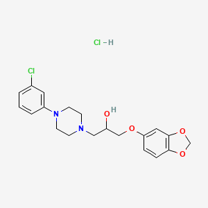 This compound is a hydrochloride salt featuring a 1,3-benzodioxole moiety linked via an ether oxygen to a propan-2-ol backbone, which is further connected to a piperazine ring substituted with a 3-chlorophenyl group. Structurally, it combines motifs associated with neurotransmitter receptor modulation, particularly serotonin and dopamine receptors, due to the piperazine and aryl components. Its design aligns with pharmacophores seen in antipsychotics and antidepressants, such as paroxetine (a selective serotonin reuptake inhibitor, SSRI), but distinguishes itself through the 3-chlorophenyl-piperazine substitution and the propanol linker .