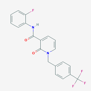 This compound belongs to the 1,2-dihydropyridine-3-carboxamide class, characterized by a lactam ring and carboxamide functionality. The structure includes a 2-fluorophenyl group attached to the carboxamide nitrogen and a 4-(trifluoromethyl)benzyl substituent at the pyridone N1 position.