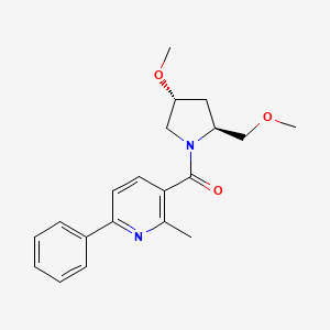 The synthesis of [(2S,4R)-4-methoxy-2-(methoxymethyl)pyrrolidin-1-yl]-(2-methyl-6-phenylpyridin-3-yl)methanone typically involves multi-step organic synthesis. The process begins with the preparation of the pyrrolidine and pyridine intermediates, followed by their coupling under specific conditions. Common reagents used in these steps include methanol, methyl iodide, and various catalysts to facilitate the reactions.