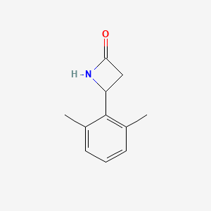 The compound 4-(2,6-Dimethylphenyl)azetidin-2-one (B6205322) , with its characteristic four-membered cyclic amide (a β-lactam ring) and a dimethyl-substituted phenyl group at the fourth position, serves as a valuable scaffold in organic synthesis. smolecule.com Its structure allows for various chemical modifications, making it a versatile precursor for a range of derivatives. The synthesis of such compounds often involves the cycloaddition of a ketene (B1206846) and an imine, a method known as the Staudinger synthesis, which is a primary route to β-lactams. mdpi.com The specific substitution pattern of This compound provides a unique starting point for creating libraries of compounds for screening and developing new therapeutic agents. The presence of the phenyl ring allows for electrophilic substitution reactions, while the azetidinone ring can be reduced or oxidized to introduce further functionality. smolecule.com