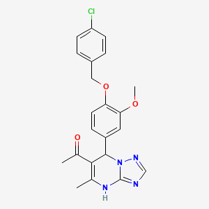 The synthesis of 1-(7-{4-[(4-CHLOROPHENYL)METHOXY]-3-METHOXYPHENYL}-5-METHYL-4H,7H-[1,2,4]TRIAZOLO[1,5-A]PYRIMIDIN-6-YL)ETHAN-1-ONE involves several steps, typically starting with the preparation of the triazolopyrimidine core. One common method involves the cyclization of azinium-N-imines with nitriles via a [3+2] cycloaddition reaction in the presence of copper acetate . This method is efficient and yields the desired triazolopyrimidine scaffold. Industrial production methods may involve similar synthetic routes but optimized for large-scale production, ensuring high yield and purity.